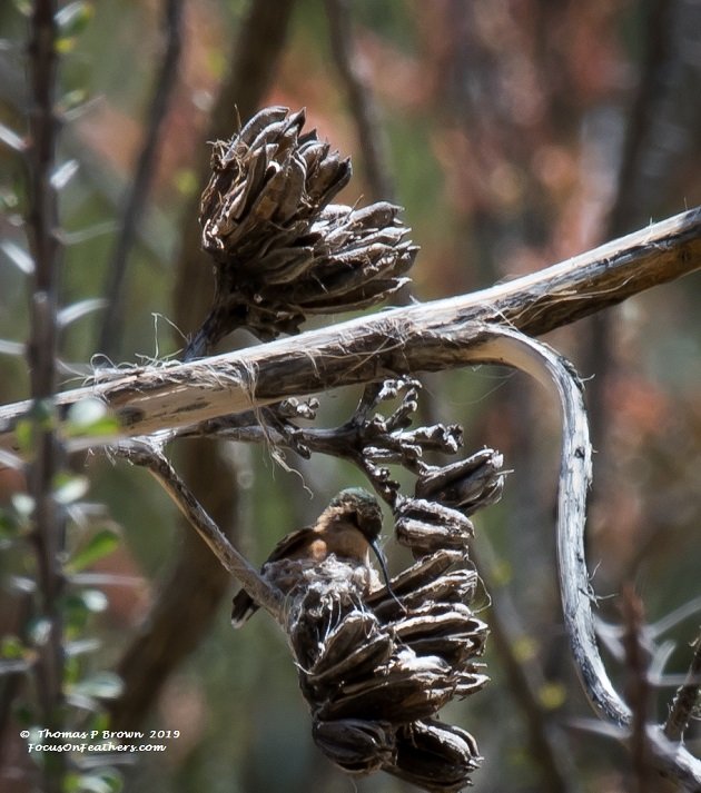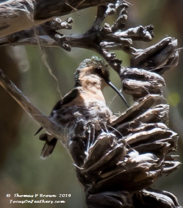 Just last week, some of our local birders spotted a female Lucifer Hummingbird, just as she was starting to establish her nest. Spotting any hummingbird nest, short of the one right outside your kitchen window is always a challenge, and so therefore a real treat. To get to see one of such a rare bird just makes it that much sweeter. The bird had located her nest on a tall Yucca bloom that had fallen over and was neatly tucked into one of the dried flower pods. Still, not exactly an easy thing to spot so I am quite thankful, especially to Brian Nicholas, for his detailed directions to the nests location.