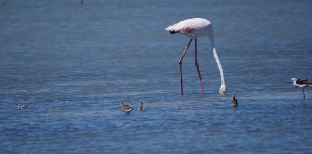 Greater Flamingoes stir the water as they feed, attracting waders. Look carefully and you might spot two Red-necked Phalaropes in this long-range photograph
