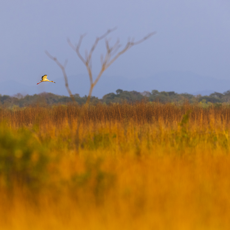 In the distance, the first of many Crested Caracaras sailed across the parched landscape. We continued on as once light began to fill the spaces, we began to perceive more and more avian activity. We hadn’t been moving for more than a minute before we came upon a Lesser Yellow-headed Vulture perched in a roadside tree. Savanna Hawks and Crested Caracaras topped almost every fencepost and shrub as we hurtled toward a field with around thirty large, white birds.