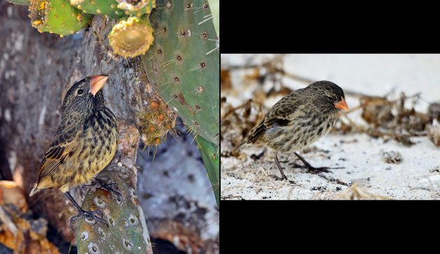 ©2011 Donna L. Schulman; Genovesa Cactus-Finch, female (Geospiza propinqua) and Small Ground-Finch, female (Geospiza fuliginosa), taken on my trip to the Galapagos in 2011. At the time these photos were taken, Genovesa Cactus-Finch was considered a subspecies of Common Cactus-Finch. Rosemary Grant original goal was to study speciation through research on what was then the Large Cactus-Finch on Genovesa. Small Ground-Finch was a rare migrant to Daphne, where it sometimes bred with Medium Ground-Finch. Its genes were found to be part of the genetic make-up of Common Cactus-Finch through this hybridization, since although Common Cactus-Finch did not breed with Small Ground-Finch, it did breed with Medium Ground-Finch.