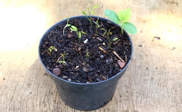 One final note: Attempting this sort of project requires almost no resources. My “tree nursery” is a collection of unsterilized, used plastic pots, filled with homemade compost (AKA aged kitchen and garden trash), placed in the dappled shade of my garden’s trees.
