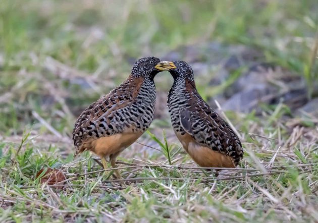 A fight between two female Barred Buttonquails – while dead serious for them – looks very much like a match between Hello Kitty and her twin sister.
