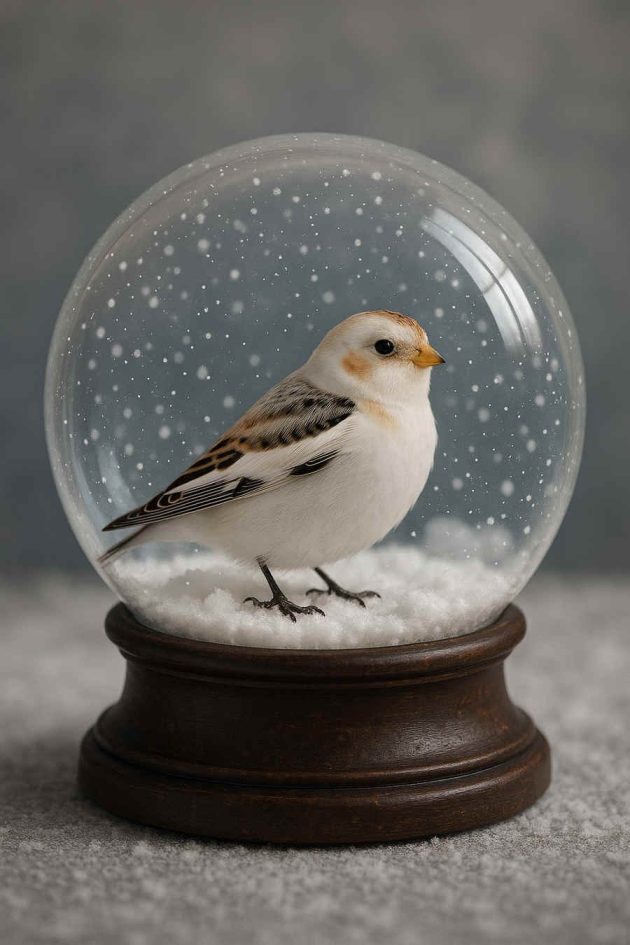 I don’t know if there are snowglobes with a Snow Bunting in them, but if not, somebody should produce them. I asked ChatGPT for a prototype: