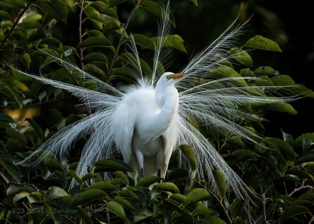 The Great Egret was in breeding plumage and courtship posture–bright lime green lores, head bending down and then snapping up, long, impossibly delicate plumes waving over its body as if possessed by independent spirits. The visitors along the boardwalk at Wakodahatchee Wetlands, Florida were taking photos nonstop, we only had a few minutes before the wetlands closed, oohing and aaahing. I thought about those plumes and about how fortunate we were to be seeing this egret in all its glory. Plume hunting raged supreme 150 years ago, when egret feathers were part of a worldwide trade in feathers and other bird parts, used for women’s hats and other articles of clothing (but mostly hats), delighting the upper classes and practically wiping out bird species. I could see what all the fuss was about, why they were worth, literally, as much as gold. “Thank goodness for the Migratory Bird Treaty Act,” I said to the photographer beside me, who just looked at me quizzically before returning to her camera.