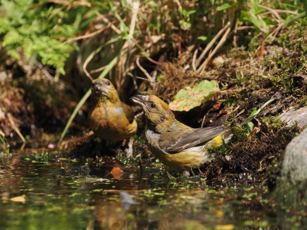Then, quite suddenly, the first individual flew down to drink, quickly followed by other members of the flock. They didn’t stop long – in some cases just a few seconds – but there was a hectic two minutes of activity with a flurry of birds. Curiously, one drinking or bathing bird invariably attracts another, and juvenile Siskins flew down to join them. The Crossbills were nearly all streaky juveniles, which prompts the question as to where they had hatched. The most likely answer is Scandinavia. They are very early nesters, so this flock had probably flown from Norway to Norfolk from across the North Sea.