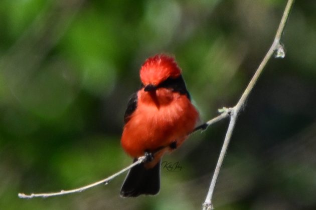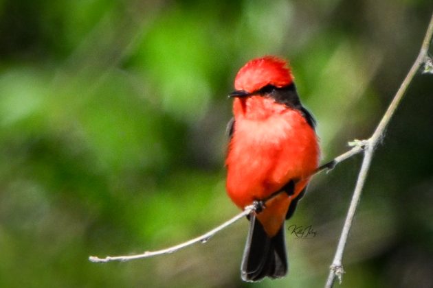 Although they can be found perched quietly among willows, cottonwoods, sycamores, or mesquite, the male Vermilion Flycatcher glows like an ember against the green. His plumage is a brilliant crimson, set off by deep brown wings and a dark mask that highlights his expression. A dashing songbird carrying the intensity of a spectacular sunset.