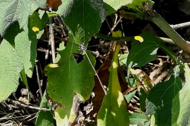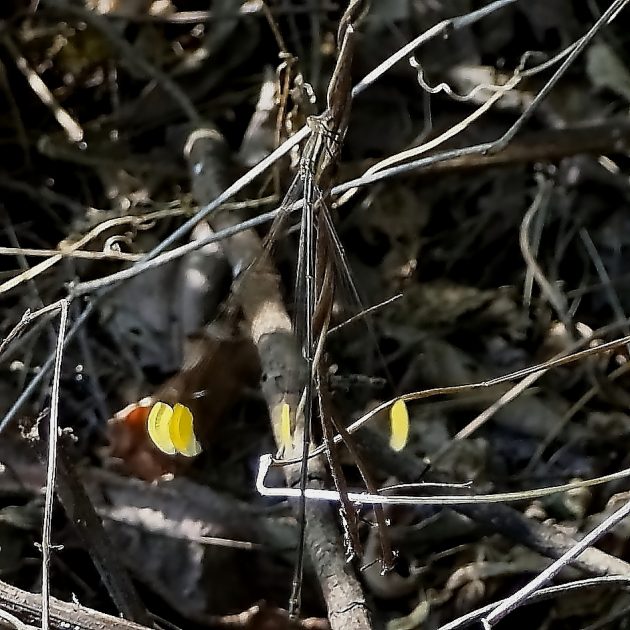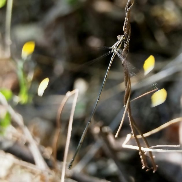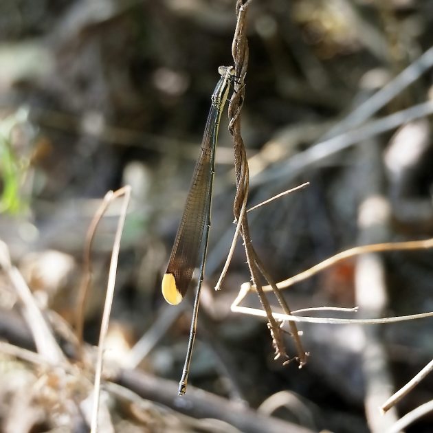 The actual explanation turned out to be almost as interesting as that fantastical theory. By following these golden lights, we eventually managed to see their source: three-inch-long, incredibly delicate damselflies with wings that were entirely transparent except for their golden tips. When they flew, those golden tips were the only thing one could see. And their name, once we determined it at home, was as unusual as these creatures themselves. These are apparently named Helicopter Damselflies. (My best uneducated guess is that they were Pseudogaster aberrans.)