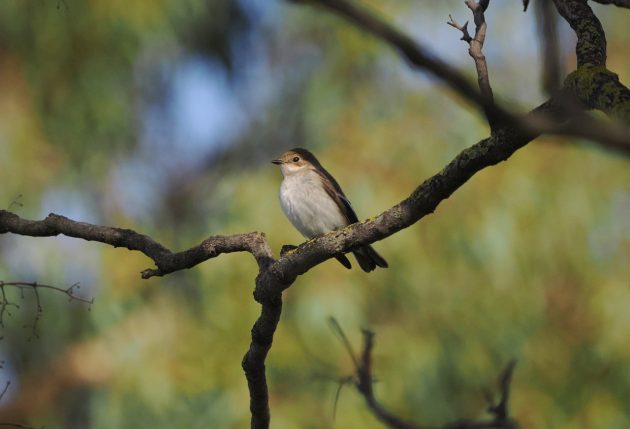 What I was delighted to see, though, were many Pied Flycatchers. Though these flycatchers do breed in Spain, the birds I was seeing were almost certainly migrants from northern Europe. Ringed birds from as far away as Russia, along with Scandinavia, Germany and Britain, have been trapped or recovered in Spain. I’d only seen one in England this year, a singing bird on Exmoor, so to see so many was a treat. However, an autumn pied flycatcher is a rather dull little bird to look at, as soon after breeding the birds moult their eye-catching pied plumage. Despite this, they are pleasing to watch as they tend to be very active, though unlike Spotted Flycatchers they seldom return to the same perch.