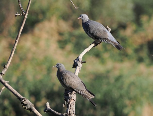 A pair of juvenile Wood Pigeons (not the lack of a white neck ring)