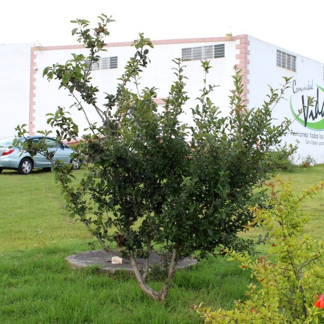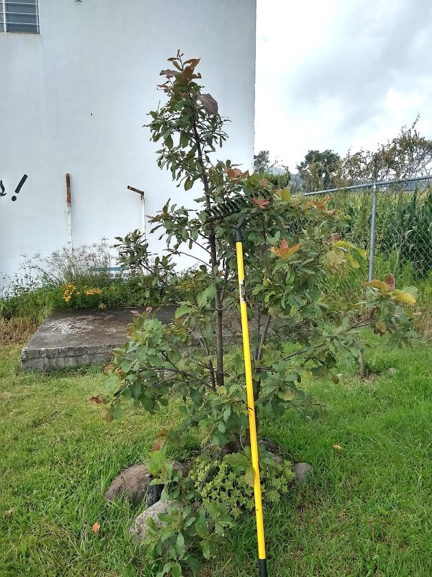 This Tejocote is the same height as that oak, but much wider… and bearing bird-feeding fruit.