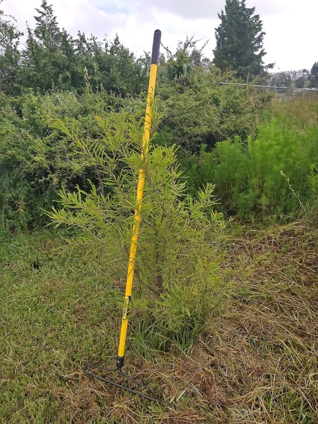 I recently read (and already quoted) this rule for growing native plants: “The first year, they sleep; the second, they creep; and the third year, they leap.” This rule has proven true in my church lot. At the very least, church members no longer look at me as if I were crazy when I talk about my “trees”, as you can actually see them now. Some of them are big enough that I decided to use a garden rake as scale. This photo shows that the rake is a good bit more than 5 feet long (about 1.6 m). For scale, I am 5 feet 8 inches tall (1.75 m).