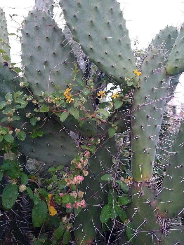 Other green patches planted themselves, although I have worked to protect them from more brush fires and being overwhelmed by annual natives. The patch shown below began with pioneering Huizaches (Sweet Acacia), which then gave shade to the seedlings of much more bird-friendly Granjenos (Spiny Hackberry), a Prickly Pear, and another tree at the left which bears small purple fruits.. Both plants have now outgrown the Huizaches and can be seen above them in the back of this photo. Wild-growing cherry tomatoes have also established themselves in this jumble; they were clearly brought there by birds, which have been spreading them from one perch to the next. Both the tomatoes and the Granjenos have now become valuable food sources, and just in time, as a wonderfully birdy Granjeno/Prickly Pear hedgerow nearby was cut down just two months ago for the construction of a four-lane road. The fruits of both are a major source of food for birds, and spiny Granjenos also provide great shelter.