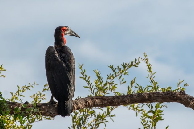 One of the most charismatic birds of the African bush has to be the Southern Ground Hornbill. Often seen strutting around through the grass in small groups, I observed these birds a few times when they meticulously take apart a snake, huge beetles, or other creepy crawlies that make you discover a more sinister nature behind their patient appearance. The wrinkled skin on their face undoubtedly indicates the same suspect disposition. I still love these birds, which are unfortunately becoming increasingly rare due to the felling of big trees which they need for nesting.