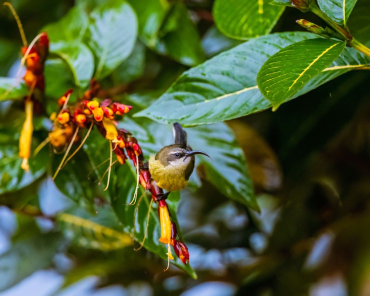 We returned to the lodge with a couple hours of “daylight” left. The clouds and rain were unrelenting, only lessening in their intensity but never entirely loosening their grip on the afternoon’s proceedings. We were tethered to the shelter of the buildings, but I did manage to pick up a curious sight: a Bronze Sunbird on a sanchezia bush – I’m much more accustomed to seeing this plant in its native Neotropics!