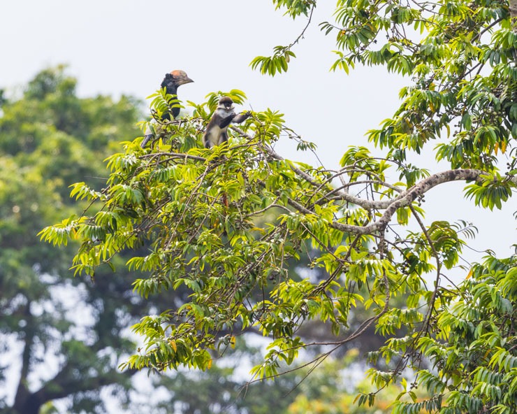 A Black-and-white-casqued Hornbill dwarfs a preoccupied Red-tailed Monkey.