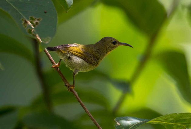 The juvenile male Crimson Sunbird looks a bit like a female Ruby-cheeked but has a very different beak, indicating its larger extent of feeding on nectar.