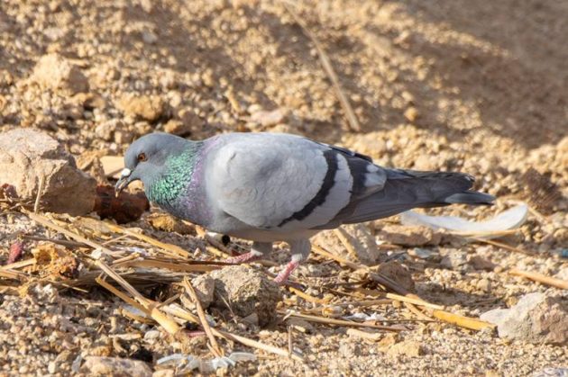 In the Bedouin village, I took pictures of a bird that I don’t often spend my photographic efforts on, a Rock Pigeon (Columba livia). Feral descendants of domesticated birds are seen in cities and agricultural areas all over the world, but there is also the fascinating “wild type”: uniformly gray, with two black wing bars and greenish to purple iridescent feathers around the neck. Wild birds nest in rocks and cliffs. To make matters more complicated, there are also “wild-type looking” feral birds, and the village had a dovecote from which obvious domestic pigeons flew in and out.