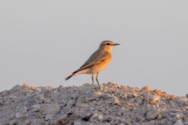 An Isabelline Wheatear (Oenanthe isabellina) is soaking up the last rays of the setting sun.