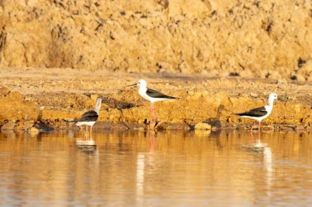 A flock of cute Black-winged Stilts (Himantopus himantopus) enjoying the presence of some water in the desert.