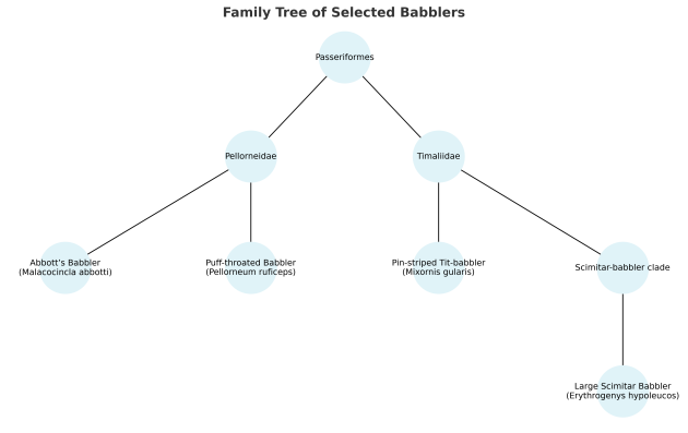However, the hide gets more interesting when looking at its babblers – though of course, the term babbler is quite a stretchy one, as this family tree of the four babblers I saw at the hide shows.