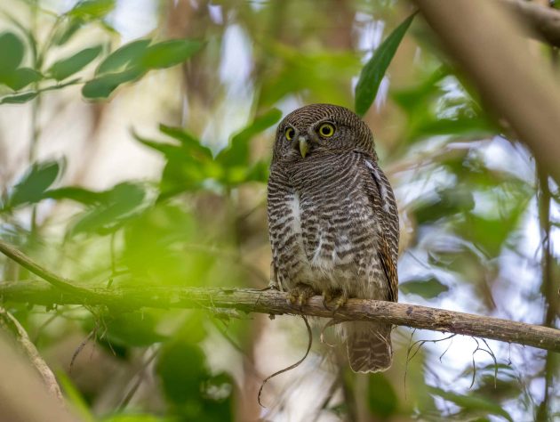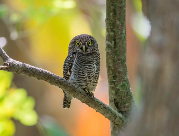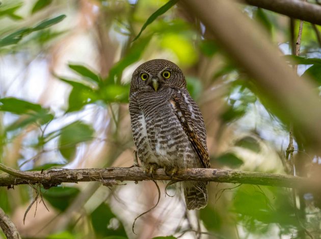 The bars across its body give it an attractive look, and the scientific name Glaucidium radiatum (radiatus means furnished with rays) also milks this aspect in a slightly exaggerated way.