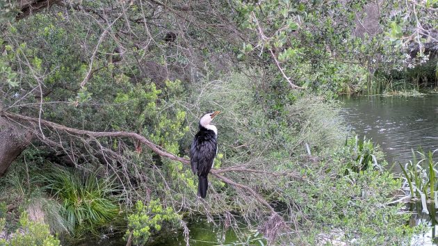 One of the unexpected bird havens on this trip was the Mornington Peninsula Hot Springs. Instead of enjoying a restorative bath as the more sane visitors were doing, I was crouching near bushes in an oversized bathrobe. The highlights were the Spiny-cheeked Honeyeater, the Brown Thornbill, the White-browed Scrubwren, the Willie Wagtail, and a Little Pied Cormorant taking a snooze in full view.