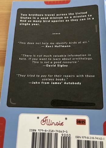 This book is hilarious. It is also astonishingly clever and, dare I say it, well-illustrated. It has all of the features of what we expect to find in a field guide—fitted to the brothers’ particular big year. It breaks down how they planned (googled “which States have the most birds” and used Google’s response as their travel guide) and, armed with that information, proceeded with their big year. The bird write-ups and illustrations are organized in the order in which the birds were seen, and in the area of the country where they were seen.