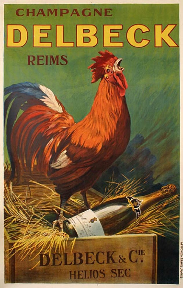 I think any one of these birds would make an excellent mascot for a bottle of Champagne or sparkling wine, but wineries so far have been reluctant to adopt them. Vintage Champagne ads are another story though, with a handful of old examples featuring domestic fowl, as in this rooster poster…