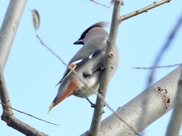 Bohemian Waxwings appear unpredictably in our area, in winter. (They usually winter in the prairies and the Rocky Mountains, but they will wander farther afield.) One will usually be seen among a flock of over-wintering Cedar Waxwings. On a lovely November day, we were driving in the Rouge Park area on the east side of Toronto. The weather was perfect, but the birds were sparse and there were only the usual species we see at this time of year. Another group of birders visited a spot we recommended and had already birded that day. They texted us with the news that two Bohemian Waxwings were with a large flock of Cedar Waxwings. We rushed to the spot. The challenge was to find the two Bohemian Waxwings. We discovered one and then noticed a second, perched close by. The birders with cameras captured some great shots, especially since the afternoon sunlight was shining on them. It was exciting for one young birder, who had joined us. He told me they were lifers for him.
