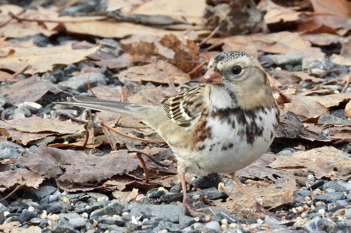 While admiring the waxwings, another birder mentioned to us a great bird, which was being seen east of us. An immature Harris’s Sparrow (pictured at top of article) was hanging out with other sparrows at a conservation area. (This bird winters on the southern plains in the US. Strays will show up with flocks of other sparrows.) Local birders were keeping it there, by tossing birdseed on the ground. Rosanne, another birding friend, and I drove over to the conservation area. We were eager to see the bird as it would be a lifer for both of us. We looked for other birders and found them by a tangle of bushes. The bird had been seen recently, but wasn’t present when we got there. They told us it would go away, but then returned shortly afterwards. As the minutes passed, I was getting nervous, because my husband needed to get home for an appointment. Just before we had to leave, the bird popped out of the bushes and landed on the strewn seeds. We had good views of it and Rosanne was able to get some great photographs.
