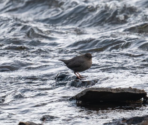 Our section started just below Benham Falls, which is less a falls and more a series of rapids, but still awe-inspiring, especially with a fresh blanket of snow on the surrounding landscape. At the base of the falls was a wide, flatter section of the river where we spotted an American Dipper bobbing its behind and foraging through the shallow rapids. We would hear and see two more on this hike – a dipper high count for me!