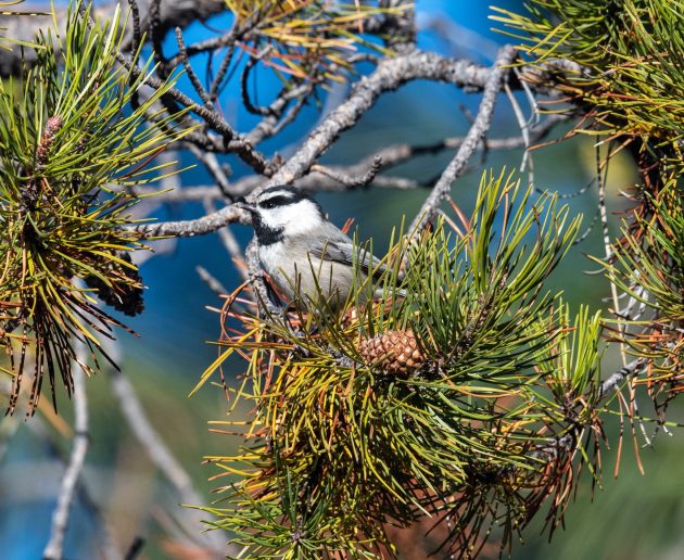 The birds were few and far between in this icy landscape, but we did happen upon another feeding flock about a mile or so from the original one. The birds were quickly moving through the pines, chattering the whole way. It was primarily composed of Mountain Chickadees, more kinglets, and a hat-trick of nuthatches: White-breasted, Red-breasted, and Pygmy! They were pretty far up in the canopy, but a little while later, we had a much lower group, and Mountain Chickadees were just feet above our heads.
