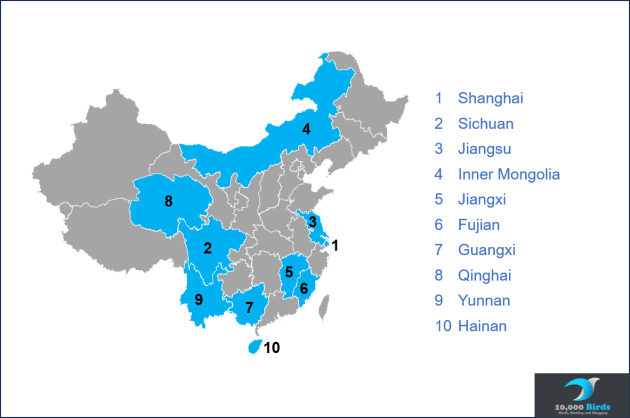China has 34 provinces (or the equivalent of provinces, some with slightly different categorizations). Here is a quick rundown of the five probably most interesting to birders.