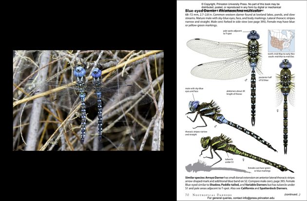 Blue-eyed Darners–Photograph (by review author) and field guide depiction  ©2025 Donna L. Schulman, photography of Blue-eyed Darners, Piute Ponds, CA & ©2024 Ed Lam, page 70, Blue-eyed Darner