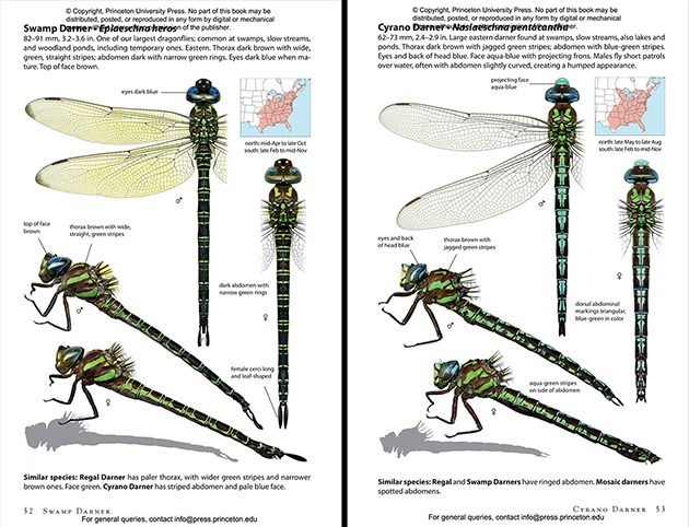 The drawings really are the main text, their use expanded with readable captions pointing to significant identification features. The brief print text at the top of the page gives common name (based on names listed by the DSA), scientific name, size, and a summary of physical appearance, habitat, and identification features to look for (also depicted and pointed out in the artwork). There is little about flight patterns and speed, this is covered in the family and genus introductions. Similar species are listed and briefly described at the bottom of the page. The importance of his section can’t be understated, just take a look at the two species, Swamp Darner and Cyrano Darner, in the above illustration. There is also a small species range map, below which is printed the distribution range, the months in which you are likely to find the species. Lam warns in the introduction that the range maps should be used carefully: most dragonfly species are highly habitat-specific and are not likely to be found everywhere in the indicated range. Also, the dragonfly (and damselfly) knowledge base is still growing, which naturalists contributing documentation of species new to an area every year to citizen-based databased like iNaturalist and Odonata Central.