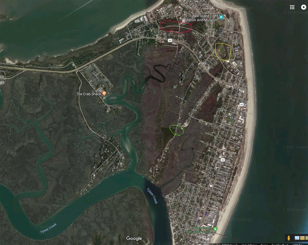 And exploring Tybee was mostly a pleasure! The south end of the island at low tide is greatly expanded by a huge expanse of sand bars where shorebirds like Willets and Red Knots feed. At high tide the same area is used by gulls and terns to roost. The north beach featured a host of Ruddy Turnstones around the jetty. Boat-tailed Grackles were ubiquitous and at any time a Brown Pelican could fly overhead. Where you reach the entrance of the gated community on Horsepen Road (circled in green below) was a great spot to find herons, egrets, and ibises roosting at high tide. The road that ran between marsh and a remnant of the maritime forest (circled in red below) was great for flocks of foraging passerines and Clapper Rails called regularly from the marsh. Jaycee Park (circled in yellow below) had Eastern Bluebirds and the slough held an Anhinga on two different visits and a Green Heron on another.