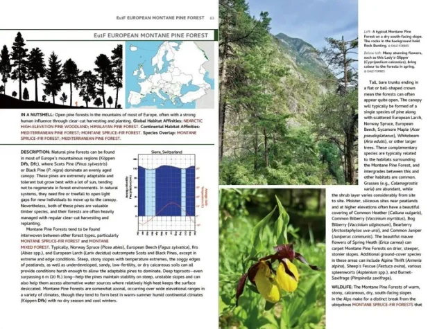 Habitat accounts start with a habitat silhouette, showing some of its distinctive plant shapes, its overall height and structure, including a human silhouette for scale. Next to it stands a range map. Dark shading is used for areas where the habitat is the predominant habitat, or one of the predominant habitats. In some maps, pale shading is used to indicate areas where the habitat is found only sporadically. Also, each major habitat is accompanied by an illustrated climate graph that allows easy comparisons between habitats.