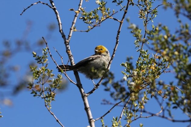 The Verdin is another desert songbird that expertly builds its nests with twigs, nestling within thorny bushes to create a fortress of protection. It eats spiders, insects, fruit and nectar, sometimes hanging upside down from branches to scan underneath leaves for food. Foraging occurs primarily in low-lying, small trees about 10 feet above the ground.