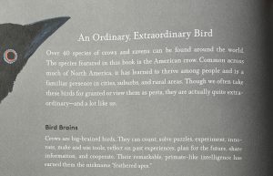 In any science-related picture book, I always recommend turning first to the end, to read the backmatter. Those pages of information help put the story into a broader context, and help provide answers to many of the questions kids might ask. Backmatter in I Am We not only includes sections on roosting, but also on the crow’s brains and communication and foraging techniques.