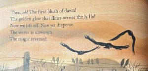 The first blush of dawn: “Now we lift off. Now we disperse. The weave is unwoven. The magic reversed.”