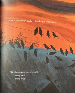 Dusk, and crows coming together… “So we blanket every surface. We cling to every edge. We bloom from every branch, every limb, every ledge.”