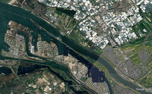 What? Yes, over the century and a half since the construction of Rotterdam’s connection to the North Sea the area has gone through a very deep ecological low in the 1970’s to what we see today: a industrial landscape with the world’s largest port, chemical plants, railroads but also with steppe-like areas, deep water with seals, porpoises and birds, lots of birds. I will not bore you with the details of all the engineering that went into the construction of this enormous port, just let’s go out and visit the Rozenburgse Landtong. The Google Earth® image below shows the landtong in the middle of the canal. The peninsula is an almost 9 km sliver of land, barely broader than a dike between the Nieuwe Waterweg and the (guess what?) Calandkanaal south of the landtong.