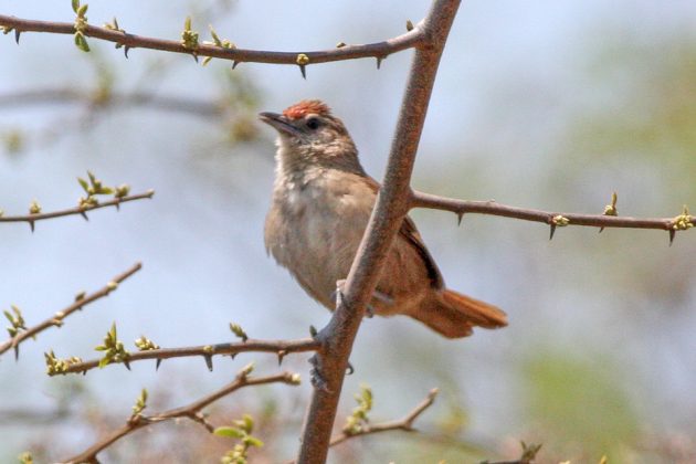 Just outside the natural areas were some farms and open fields. It is here we encountered more common birds, like the world-conquering House Sparrow. We were in Brazil so the cow-loving Cattle Tyrant, Western Cattle-Egret and Shiny Cowbird held no surprise. Brazilians like their bovines dead and on a barbeque, but birds prefer the defecating form. Sayaca Tanager and Great Kiskadee near the farm houses, and Blue-black Grassquit in the grassy meadows. We also spotted a single specimen of White Monjita and two Masked Water-Tyrant. The Rufous-fronted Thornbird that had triggered my memory had built a massive nest in a tree along the country path. These birds are members of the Furnarid family – mainly brownish birds that compensate for their dull looks with interesting behaviour. I have mentioned the Rufous Hornero before, a species after which the family has been named. Not all Furnarids are potterers. David’s Firewood Gatherer and my Rufous-fronted Thornbird break every fire safety regulation by stockpiling flammable sticks and twigs up in a tree. They then sit back, look proudly at their work and call it a nest. These bad boys are so confident and charming that females fall for the ruse and lay their eggs in the contraption – I am not saying feminism is dead, but…