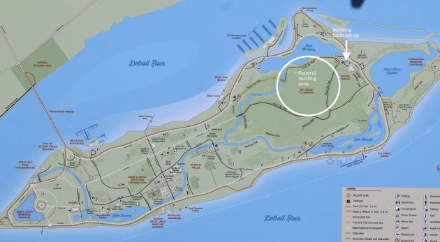 Belle Isle State Park map. Banding area is circled; location of banding table is indicated with the arrow.