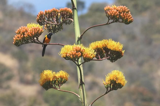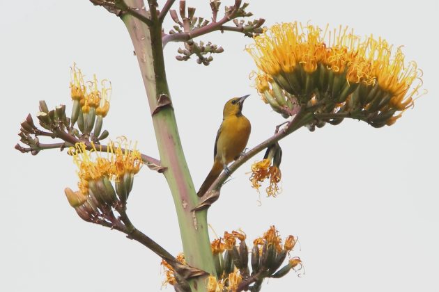 This Black-vented Oriole, seen on the dirt road to Arúmbaro, was a male. The same agave stalk hosts a female of that species in the title photo above. Streak-backed and Black-vented Orioles are both non-migratory orioles, found from central Mexico through Central America.