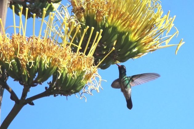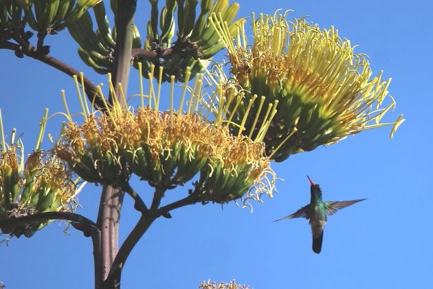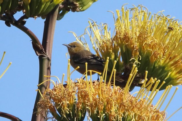 I have been seeing a lot of agave stalks in flower on my recent outings, and a lot of birds visiting them. The stalks are colorful, and the birds that visit them (New World orioles and hummingbirds) are also colorful. So for the rest of this post I will let the pictures do most of the talking.