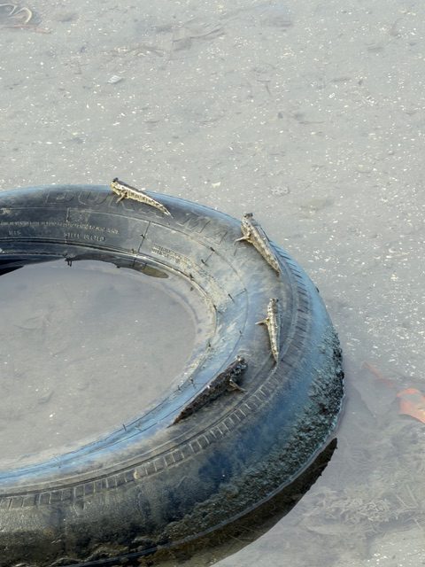 We stood along the boardwalk and stared out at the edge of the lagoon for something vaguely frigatebird-like – nope. However, I was pleasantly surprised to see a few Brown Boobies! A few shorebirds did come in to pick around the mudflats: Bar-tailed Godwit, Gray-tailed and Wandering Tattlers, and Ruddy Turnstones, I also enjoyed watched mudskippers. So back in the car to get to Queens Road, and just a couple of hundred meters later, a frigatebird passed over the car! My husband, Erik, did some quick driving maneuvers, which put us in a great spot to watch it soar over the road and houses.