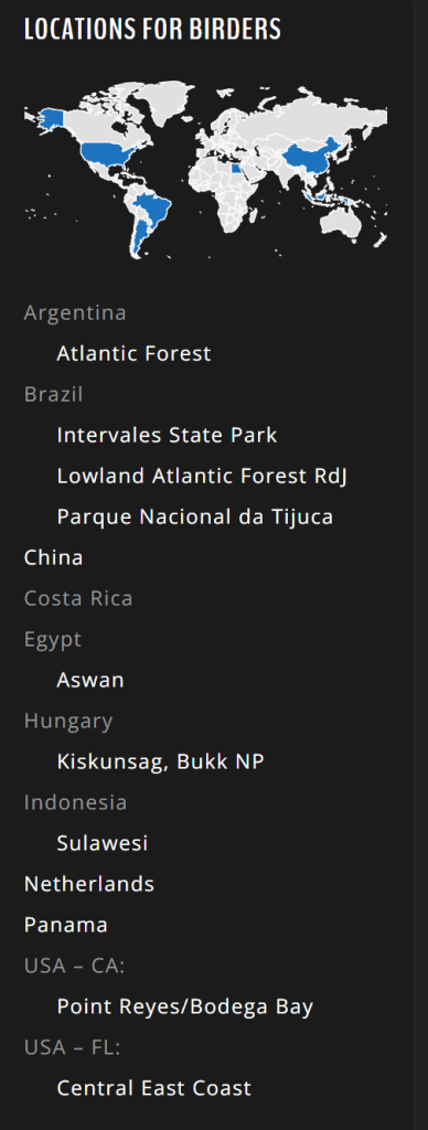 Concise descriptions of interesting birding locations, providing high-level information on the main species, the most exciting birding spots, and practical information such as the best season and which guidebook to recommend.