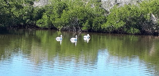 American White Pelicans swimming in front of mangrove trees