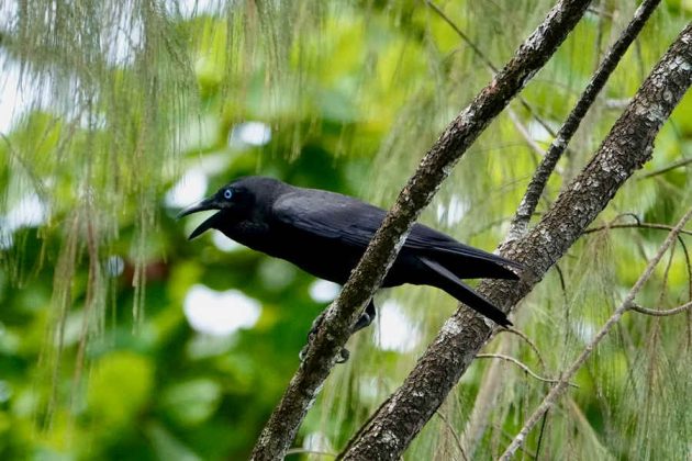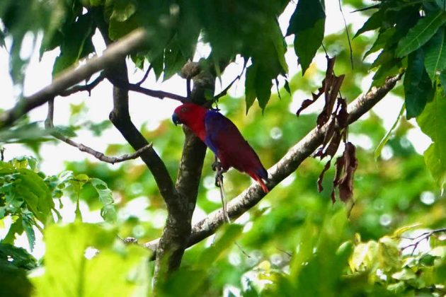 A morning walk through village gardens to lowland forest on the slope of Mount Garbuna added Pacific Koel, Amboyna Cuckoo-Dove, Blyth’s Hornbill, Sacred Kingfisher, Song Parrot, Red-flanked Lorikeet, Ashy Myzomela, Varied Triller, Spangled Drongo, Northern Fantail, Long-tailed Myna and Red-banded Flowerpecker.